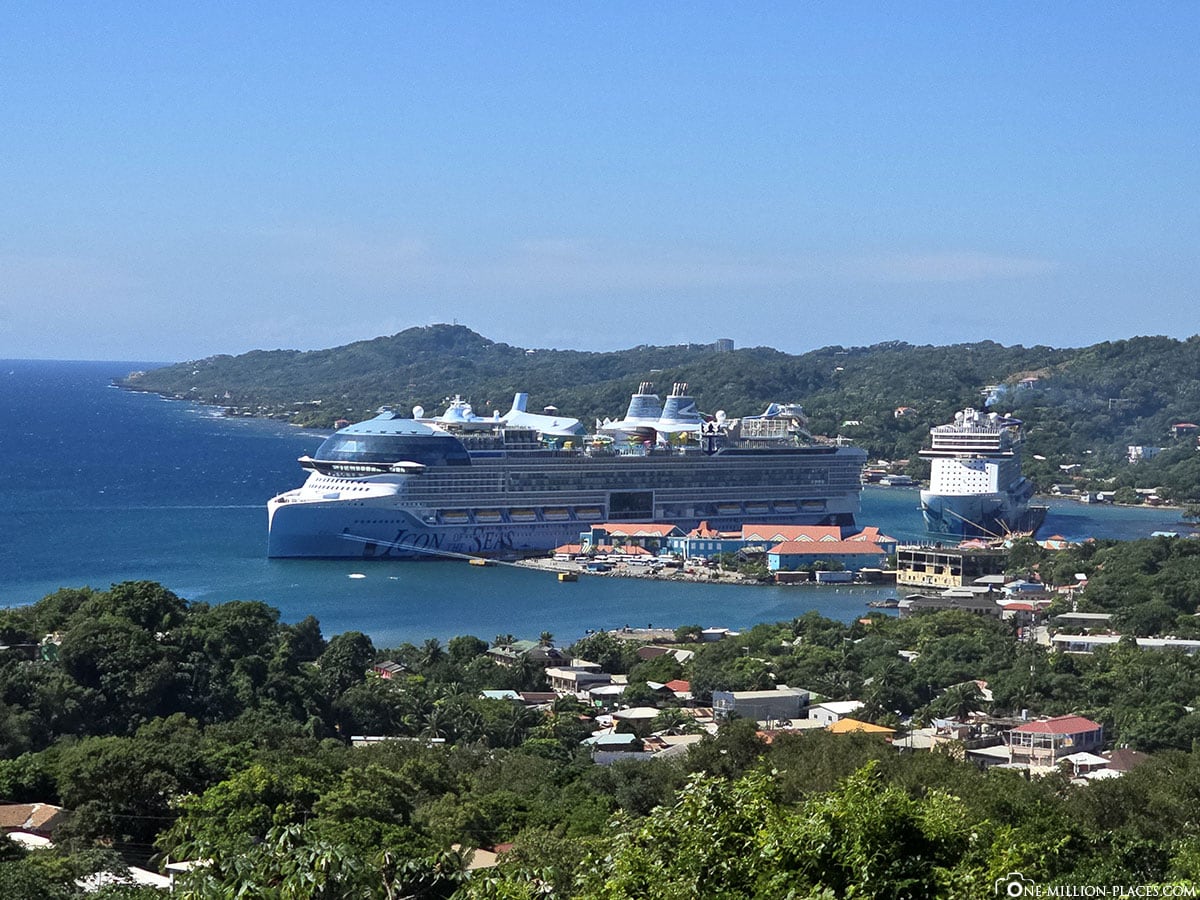Unser nächster Halt war mit dem Auto nur 3 Minuten enfernt. Der Mirador Roatán ist ein Aussichtspunkt hoch über der Insel. Von hier aus eröffnet sich ein spektakulärer Panoramablick über den Dschungel, die Küstenlinie und das karibische Meer. Von hier konnten wir auch gut unser riesiges Kreuzfahrtschiff Icon of the Seas im Hafen von Coxen Holen sehen.