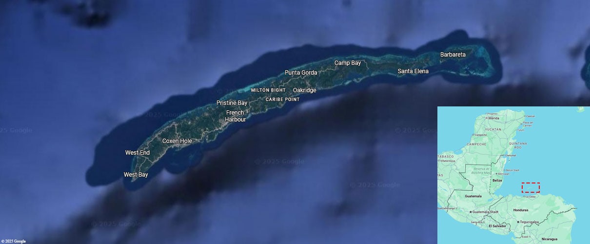 Die Insel Roatán ist die größte der honduranischen Bay Islands und liegt rund 65 Kilometer vor der Nordküste von Honduras in der westlichen Karibik. Mit einer Länge von etwa 77 Kilometern und einer Breite von bis zu 8 Kilometern umfasst sie eine Fläche von rund 83 Quadratkilometern und beherbergt ungefähr 75.000 Einwohner.